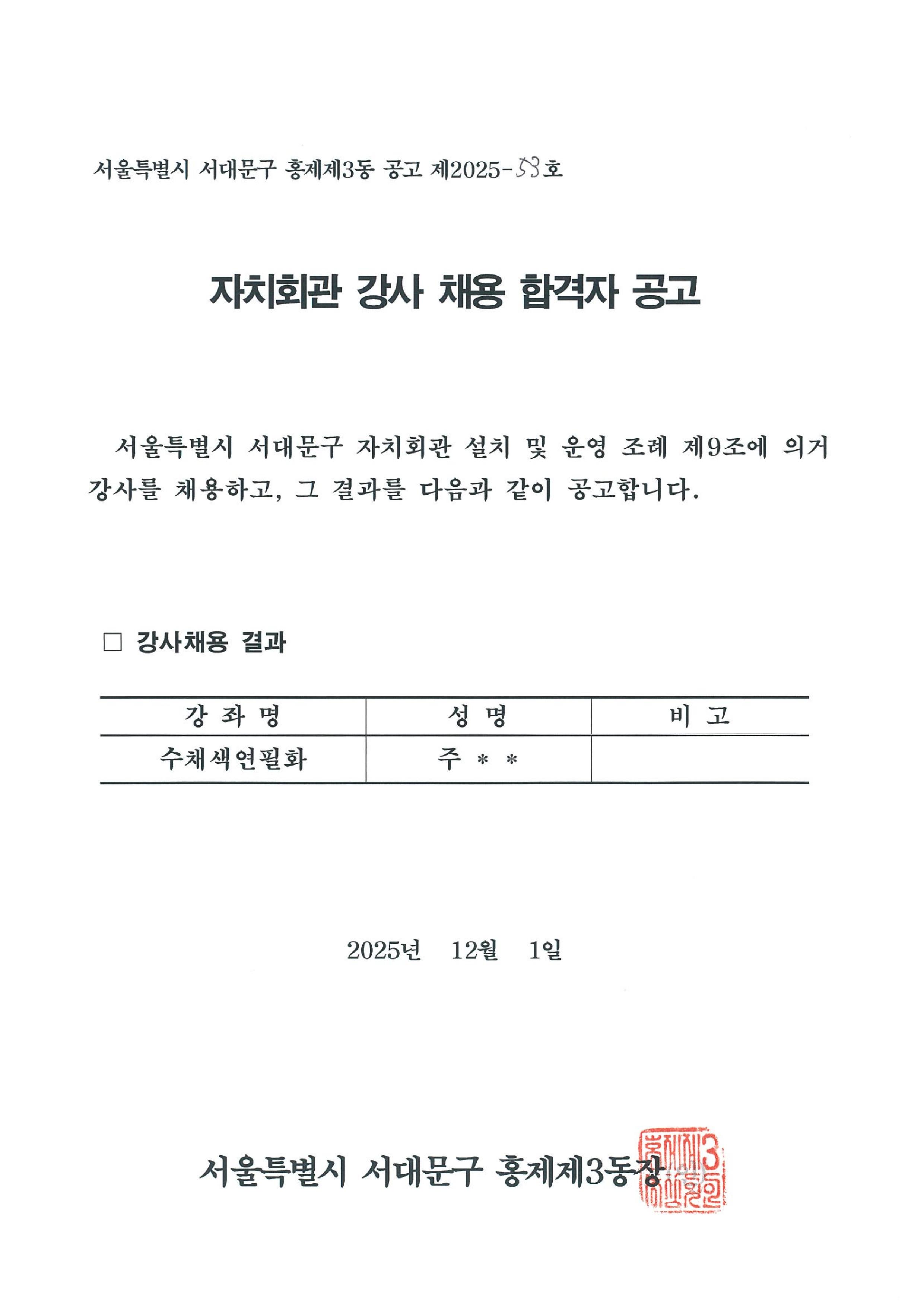 | Á¦¸ñ | È«Á¦3µ¿ ÀÚġȸ°ü °»ç ä¿ë ÇÕ°ÝÀÚ °ø°í | ´ã´çºÎ¼ | È«Á¦3µ¿ |