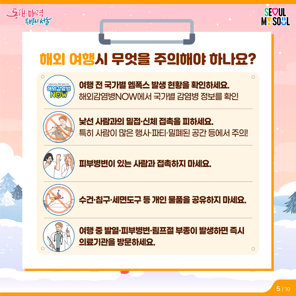- 여행 전에는 해외감염병 NOW에서 각국 감염병 상황을 꼭 확인하고 개인위생을 철저히 지키는 것이 중요합니다!