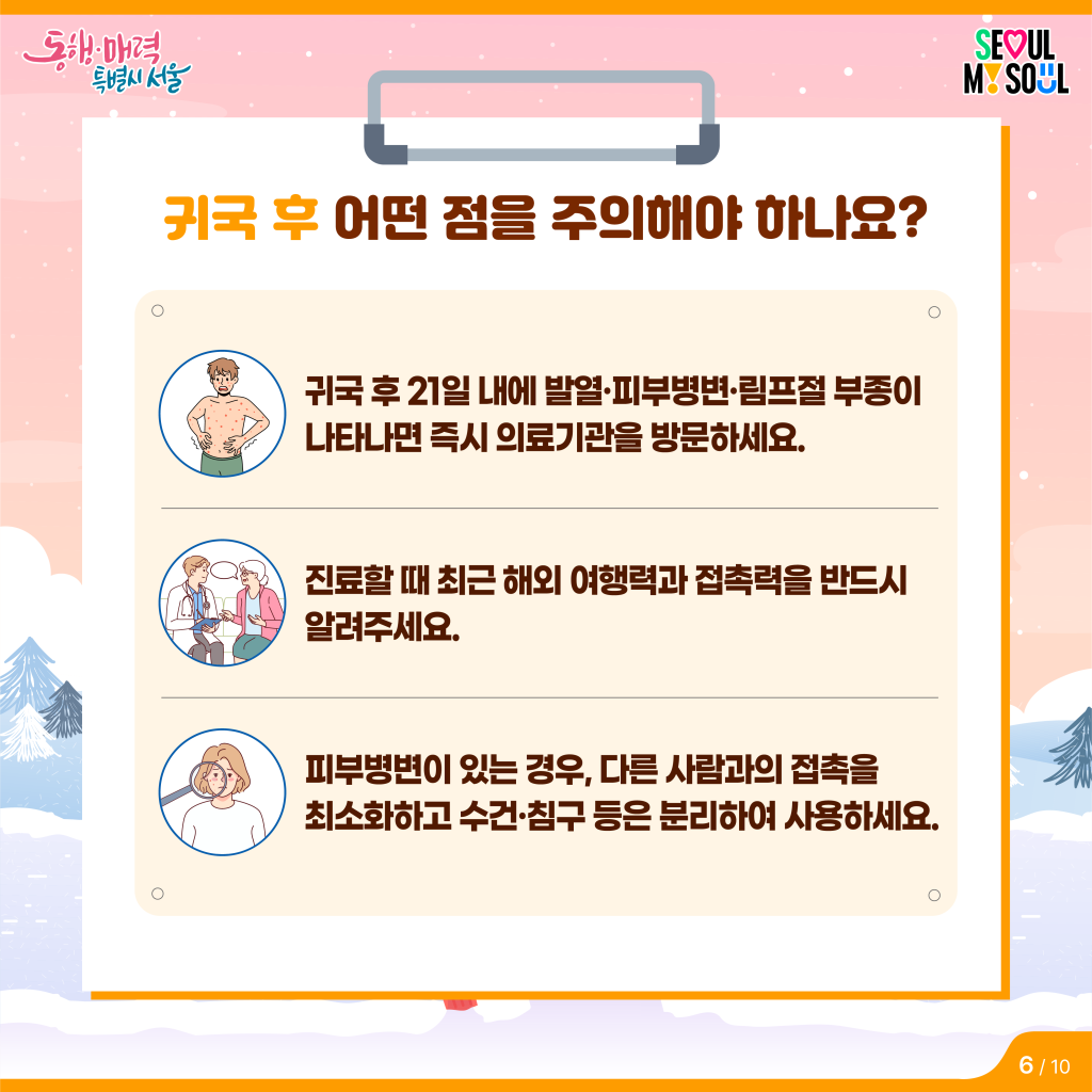※개인위생 철저히/피부병변 있는 사람과 접촉 피하기/귀국 후 증상 발생 시 지체없이 진료※