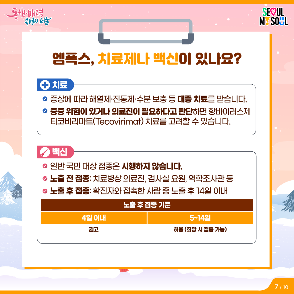 - 중증 위험이 있거나 의료진이 필요하다고 판단하면 항바이러스제 티코비리마트(Tecovirimat) 치료를 고려할 수 있습니다.