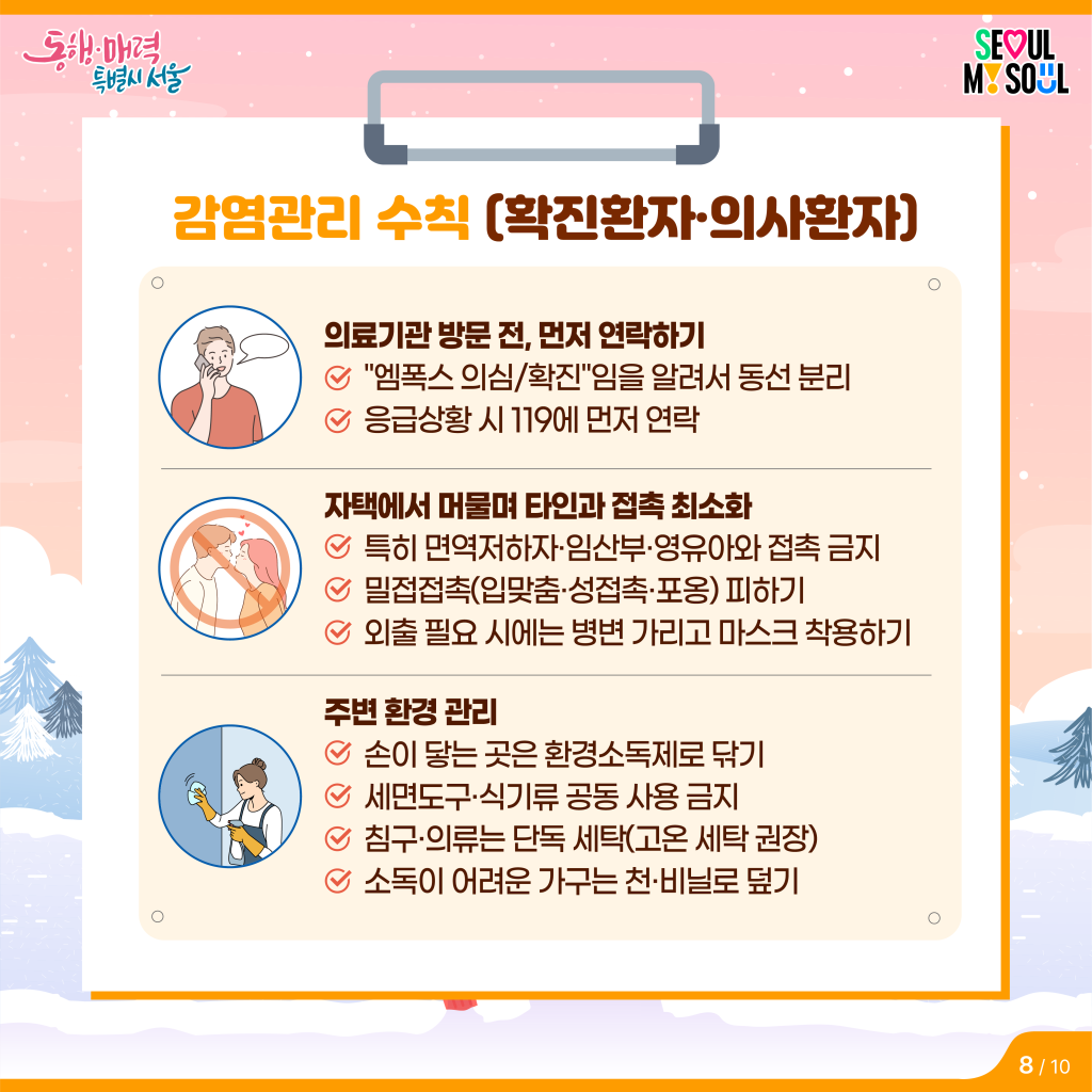 - 해외여행 중에는 밀접접촉·개인 물품 공유를 피하고, 귀국 후 21일 동안 발열·피부병변·림프절 부종이 나타나면 즉시 의료기관을 방문해 최근 여행력을 알려주세요.