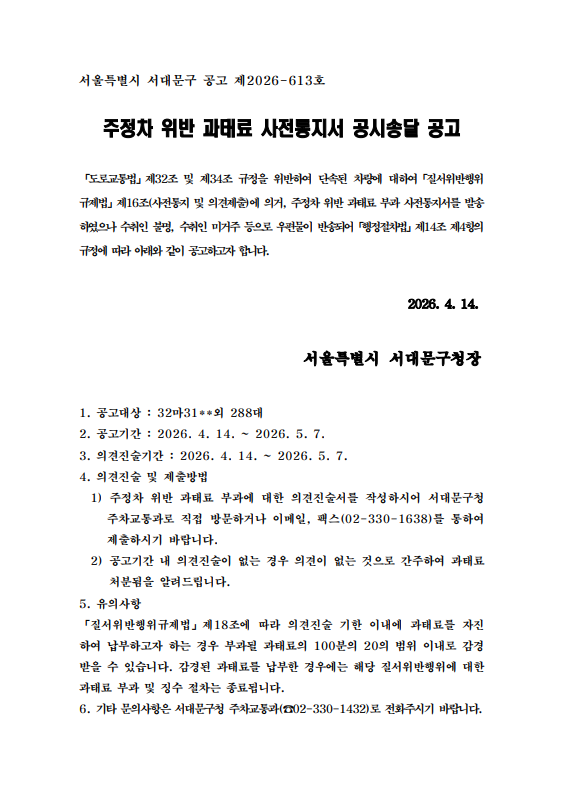 | Á¦¸ñ | ÁÖÁ¤Â÷ À§¹Ý °úÅÂ·á »çÀüÅëÁö¼ °ø½Ã¼Û´Þ °ø°í | ||