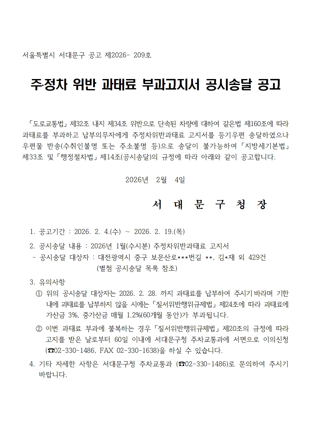 | Á¦¸ñ | 2026³â 1¿ù ¼ö½ÃºÐ ÁÖÁ¤Â÷À§¹Ý°úÅÂ·á ºÎ°ú°íÁö¼ °ø½Ã¼Û´Þ °ø°í | ||