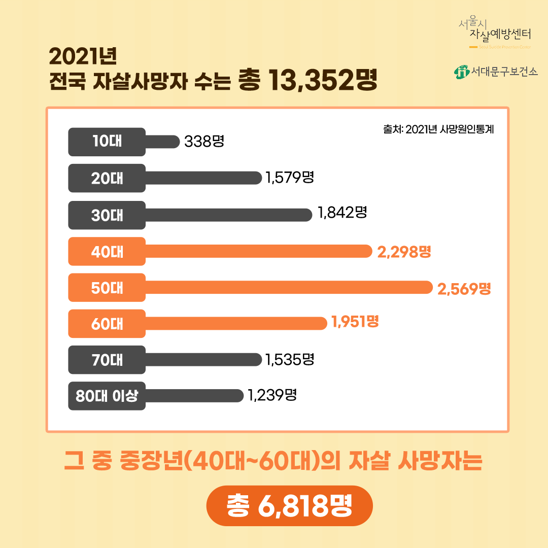 그 중 중장년(40대~60대)의 자살 사망자는 총 6,818명