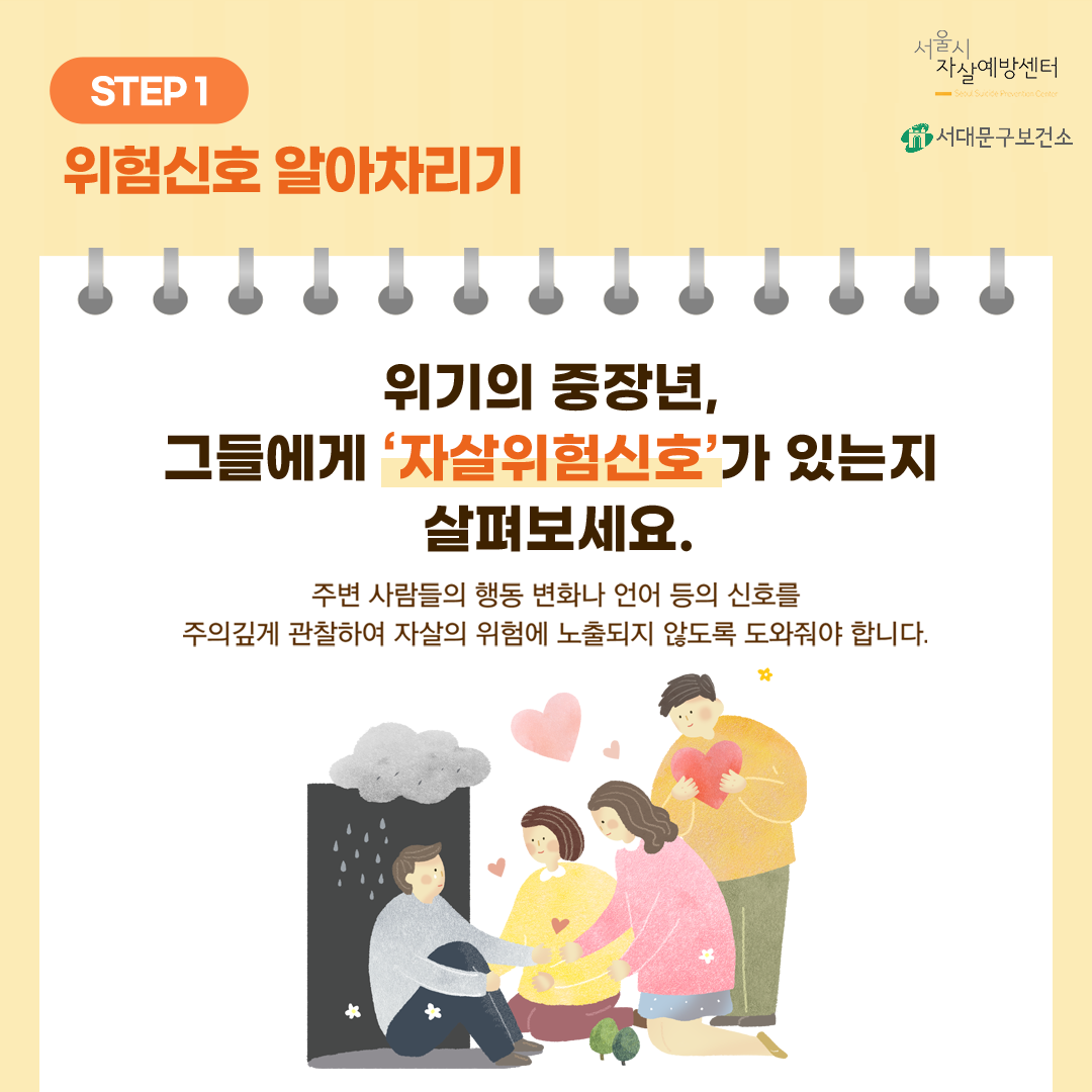 자살 위험신호를 보내고 있는지, 말, 행동, 상황의 변화를 포착해주세요.