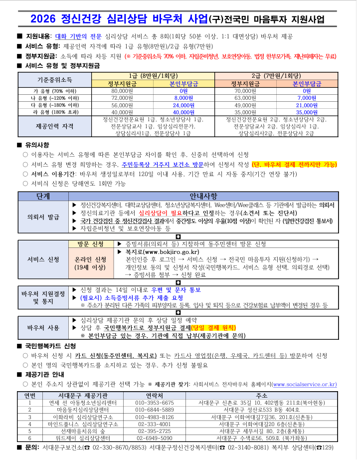 2026년 정신건강 심리상담 바우처 사업관련 지원대상 및 지원기준을 아래와 같이 안내하오니, 심리상담이 필요한 대상자분의 적극적인 관심과 신청을 바랍니다. <주요 변경사항> - 신청기간: 2026.1.1.~12.31.(예산소진시 까지) ∗ 바우처 사업 연도전환 준비에 따른 시스템 사용 중단으로 2026.1.5.(월)부터 신청가능 - 서비스 가격: 기준중위소득에 따른 정부지원금 변경(본인부담금 0~50%)