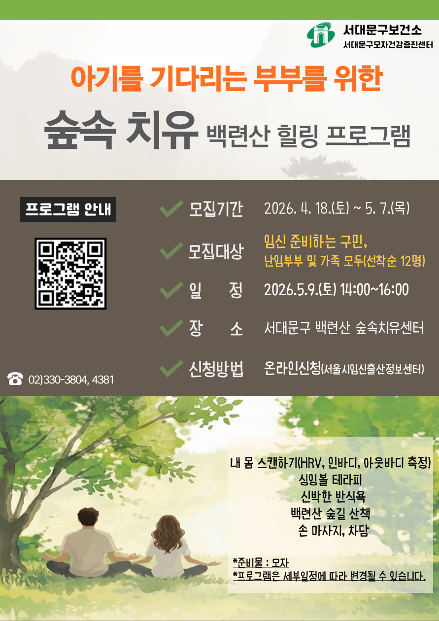 제목 (5월)아기를 기다리는 부부를 위한 숲속 치유 백련산 힐링 프로그램