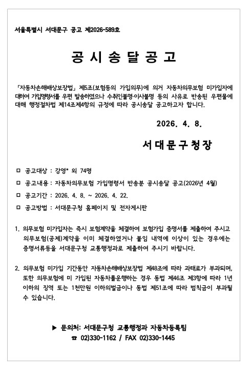 | Á¦¸ñ | ÀÚµ¿Â÷Àǹ«º¸Çè °¡ÀÔ¸í·É¼ ¹Ý¼ÛºÐ °ø½Ã¼Û´Þ °ø°í(2026³â 4¿ù) | ||